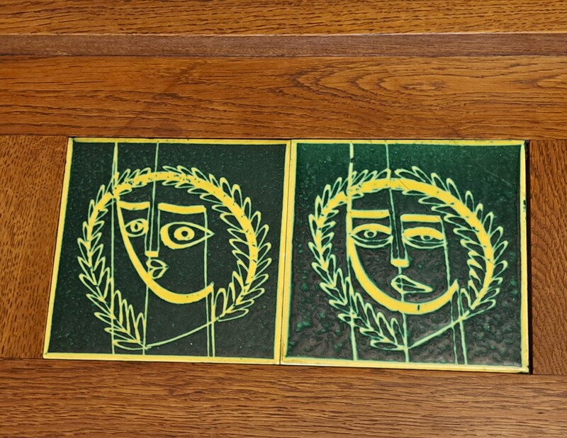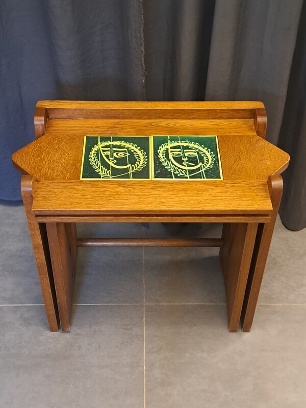 2 nesting tables in solid oak and earthenware tiles