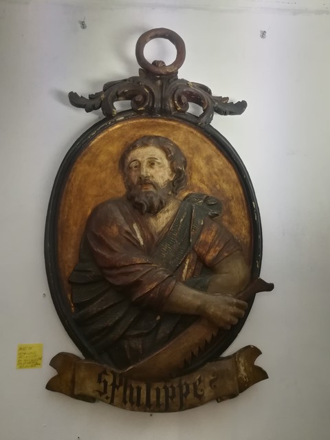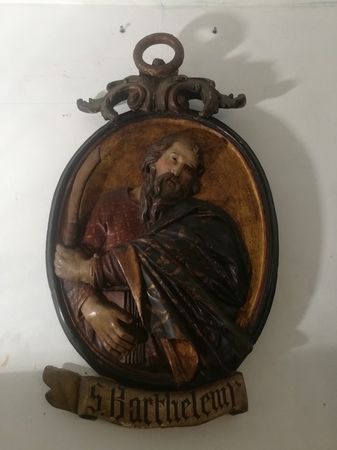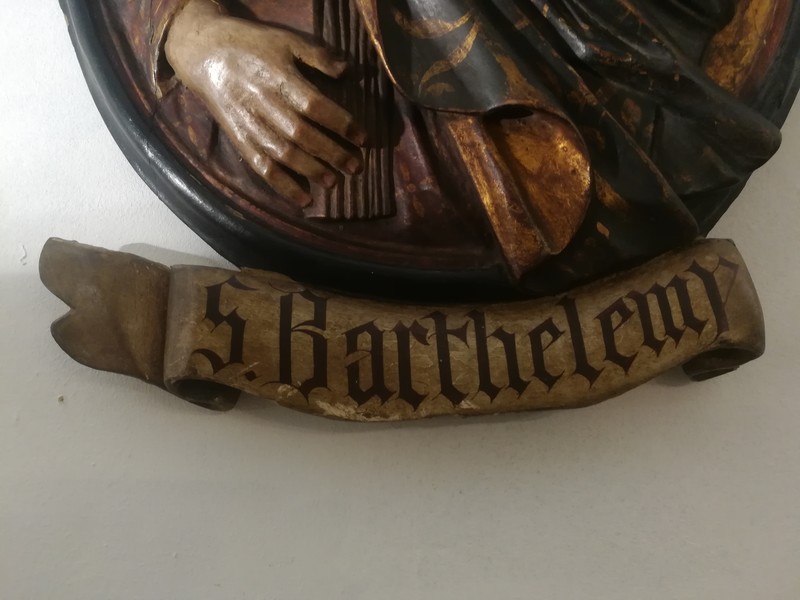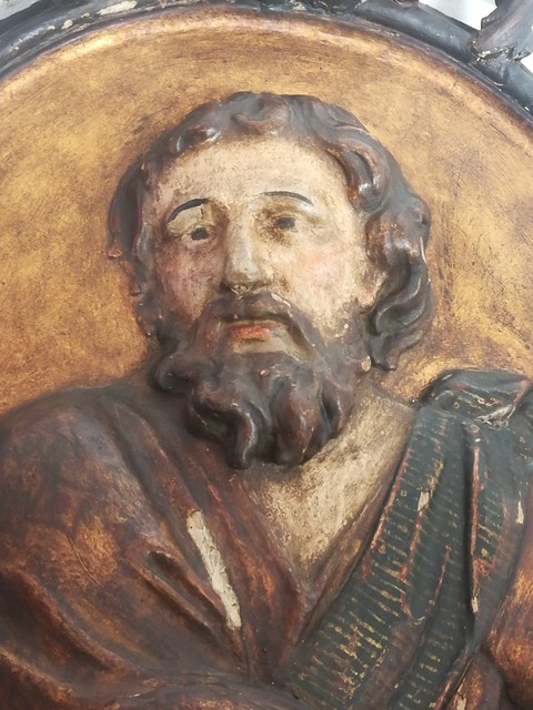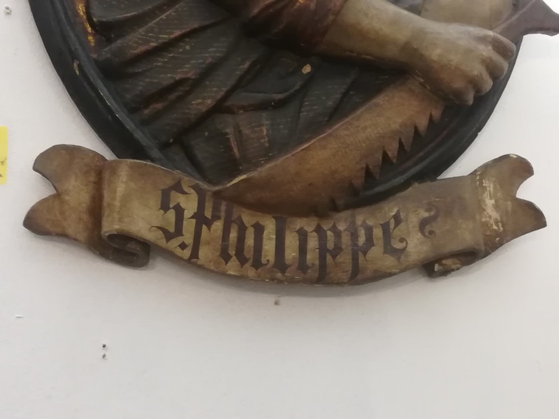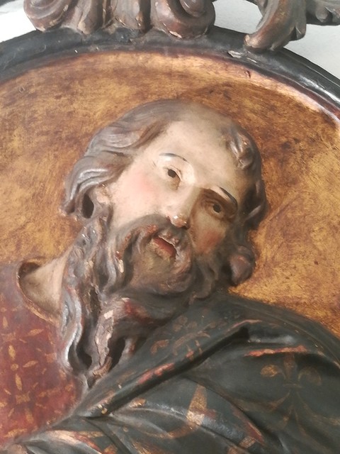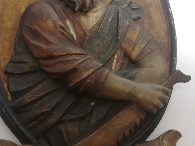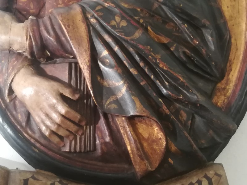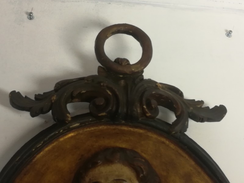 Pair of large polychrome carved wooden medallions