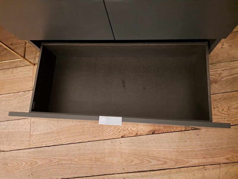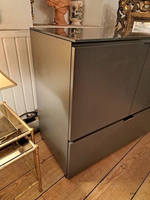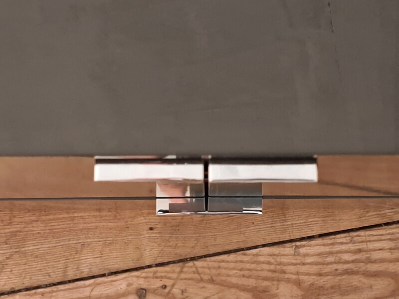 Gray lacquered sideboard, chrome metal and smoked glass top