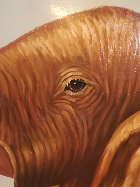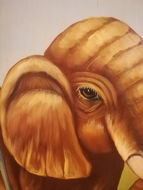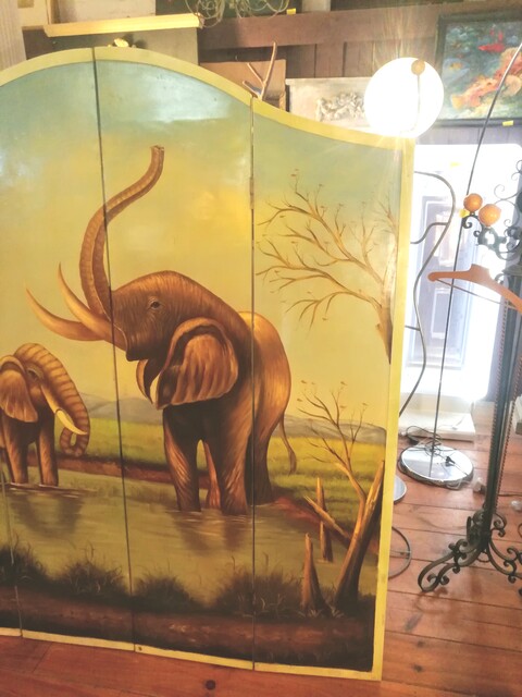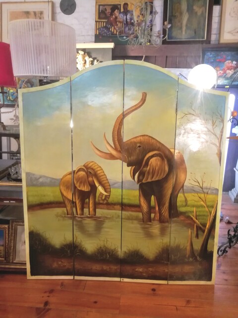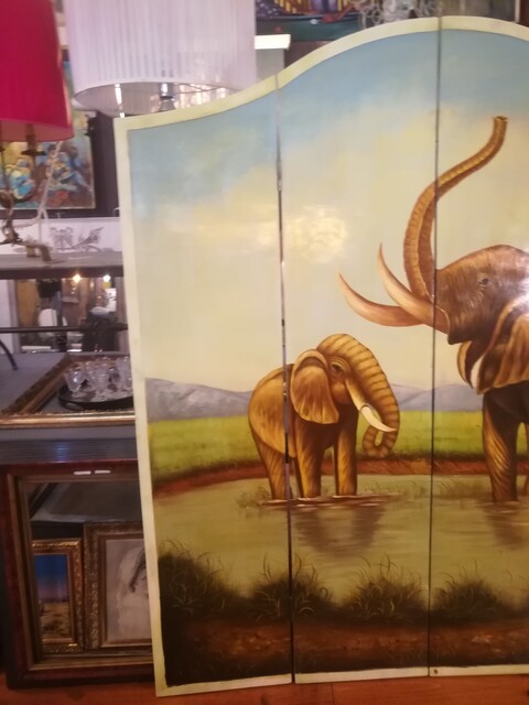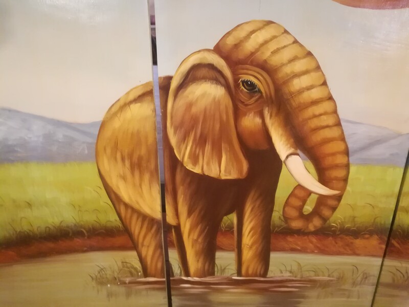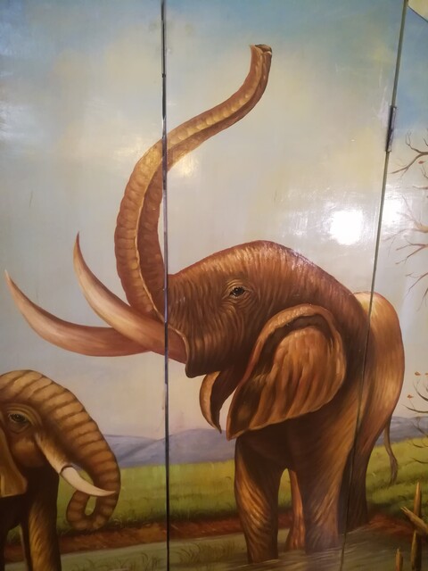 Handpainted wooden screen representing elephants in the savannah