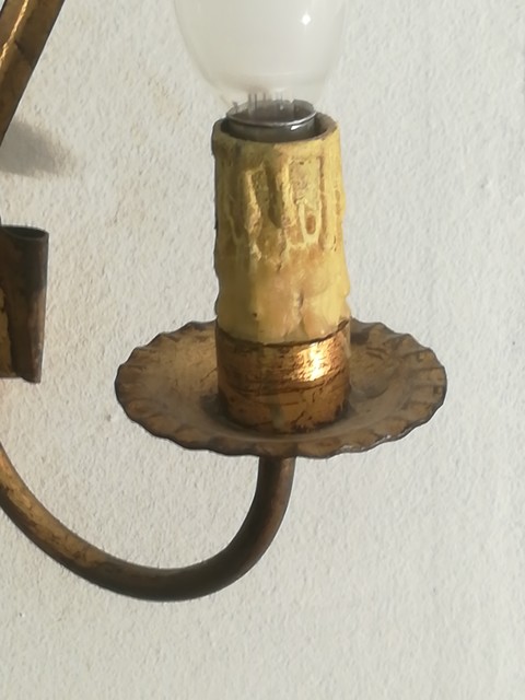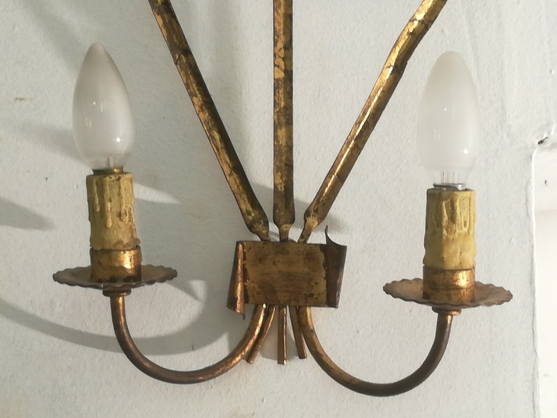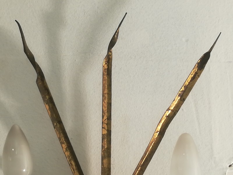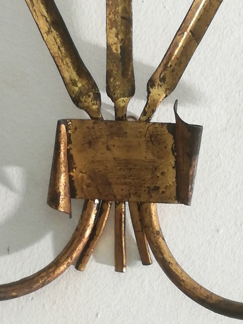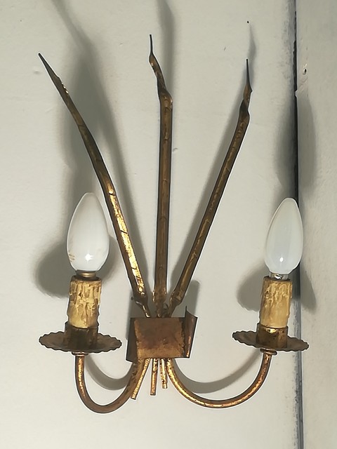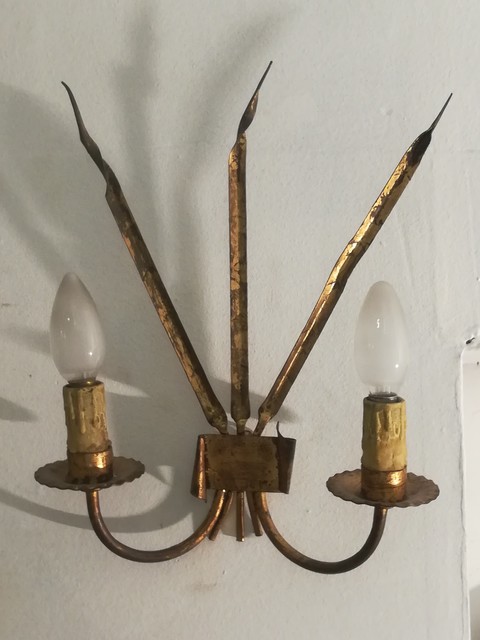 Pair of golden metal sconces with reed leaves
