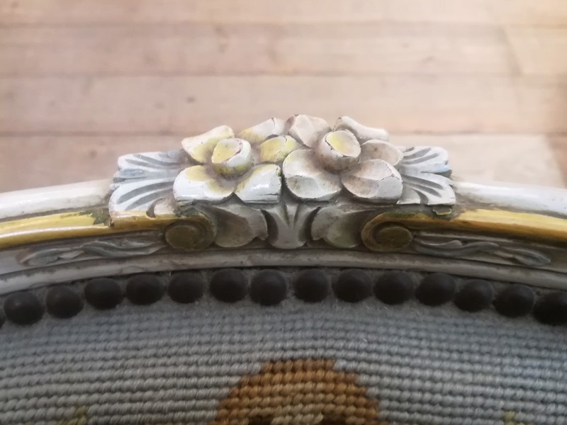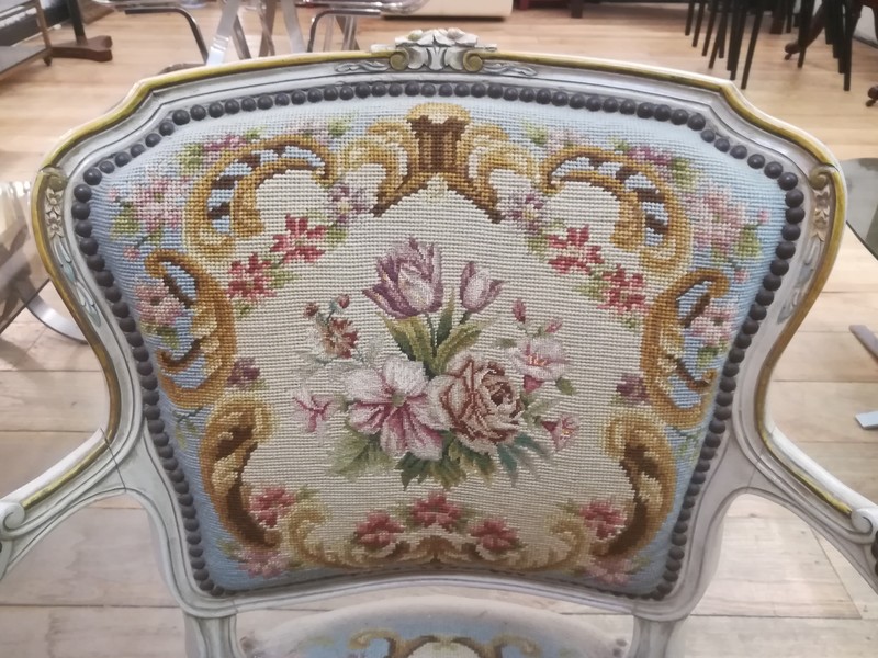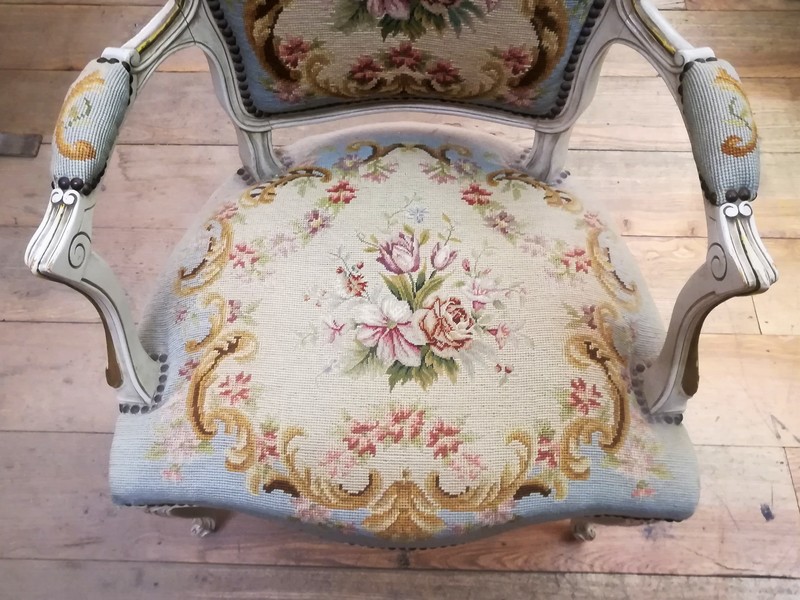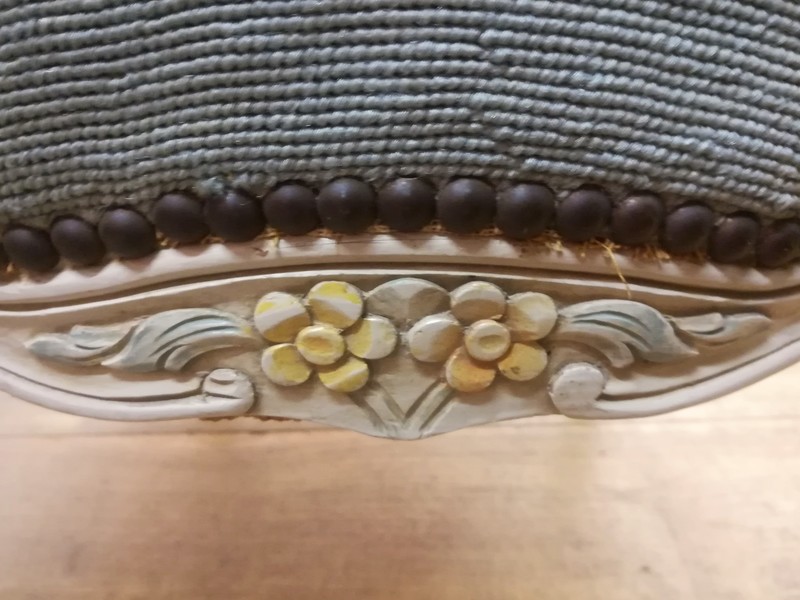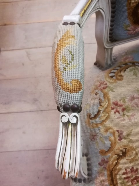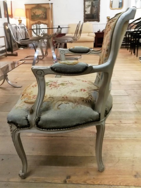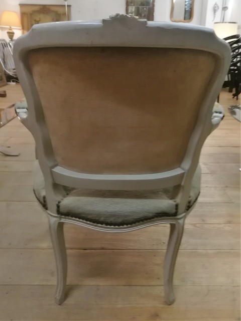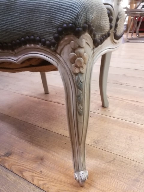 Patinated and upholstered Louis XV style cabriolet armchair