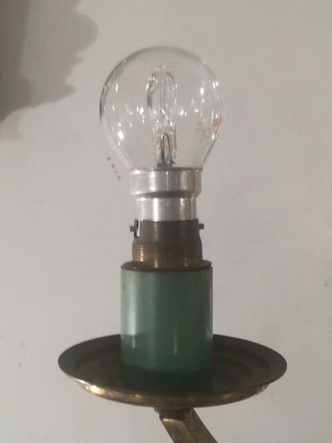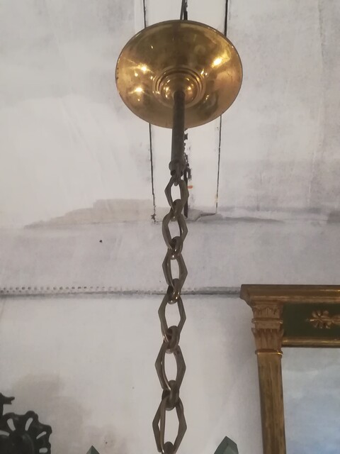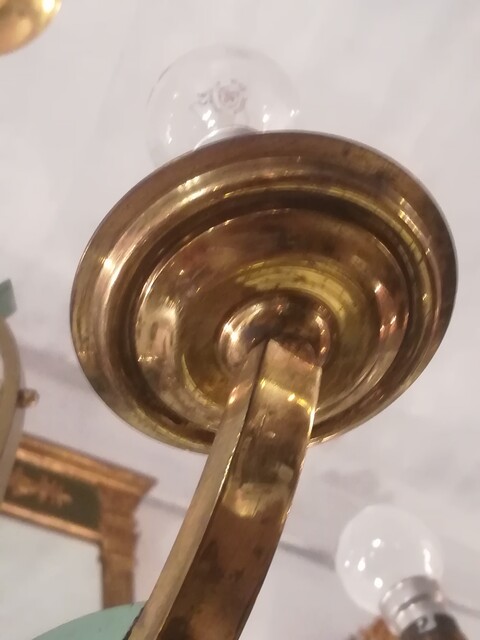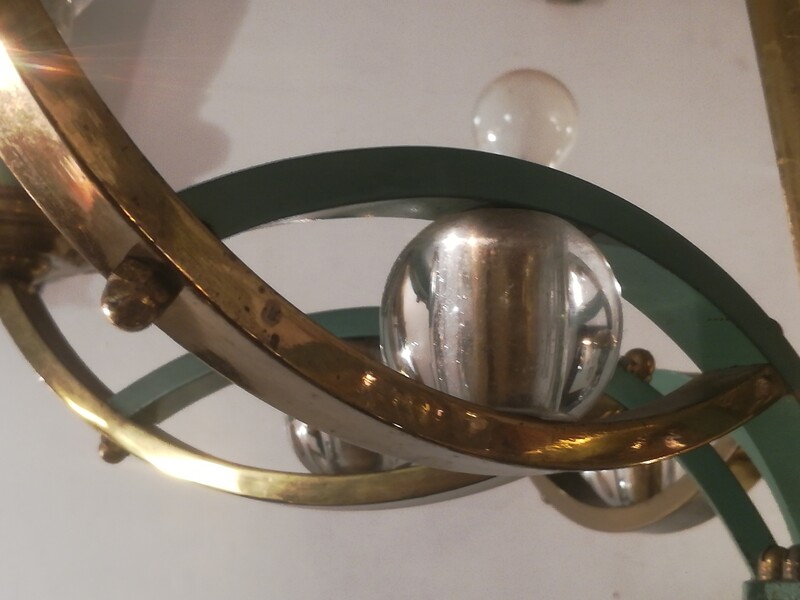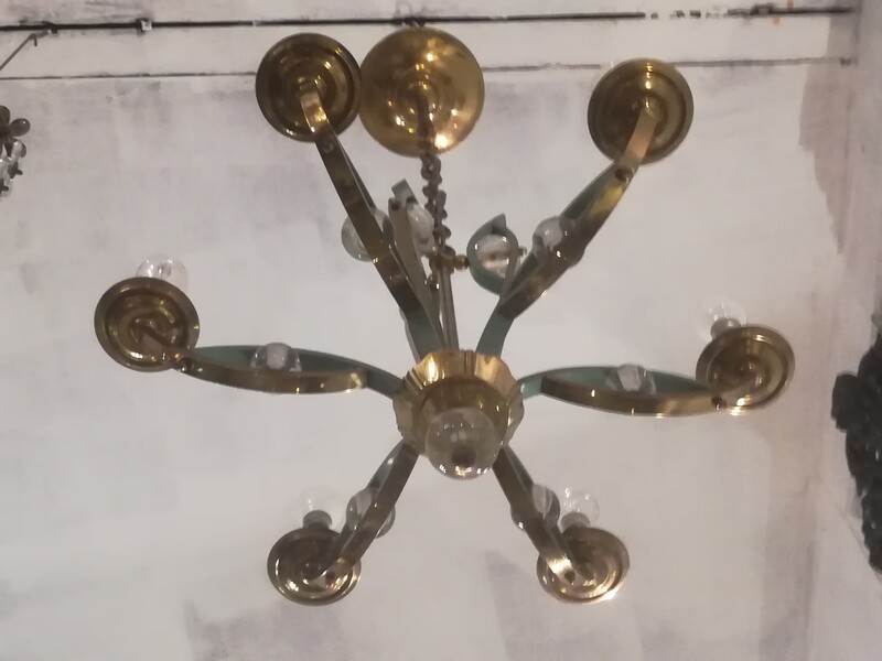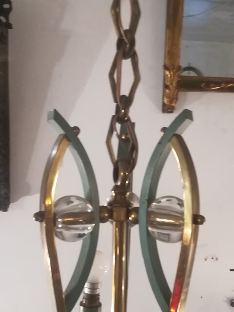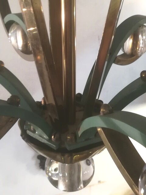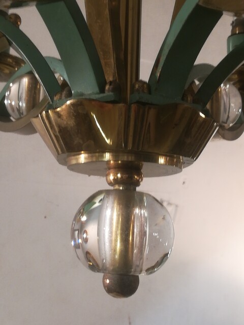 Brass, glass and patinated green Jacques Adnet 6 lights chandelier