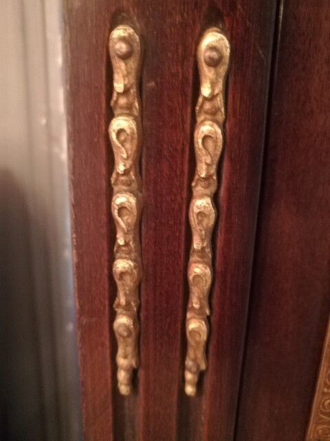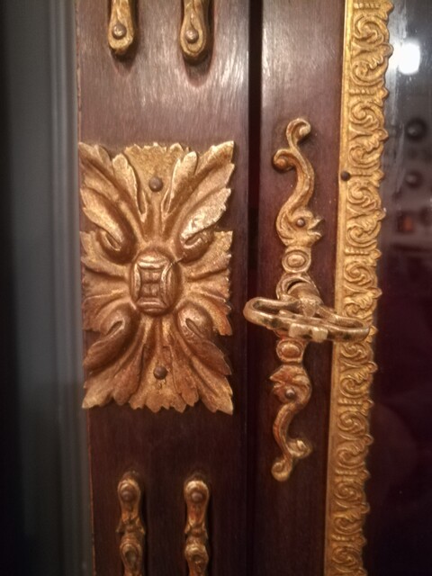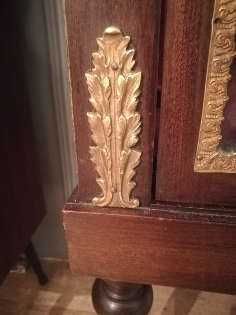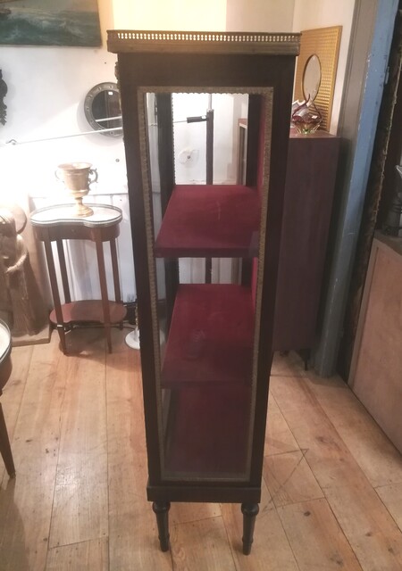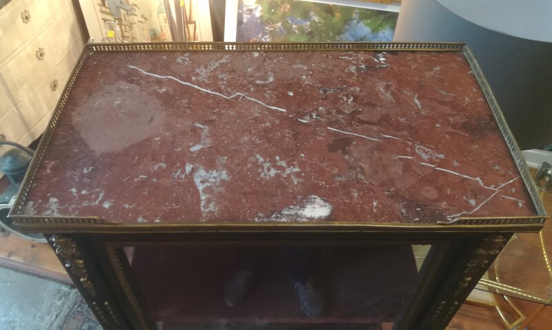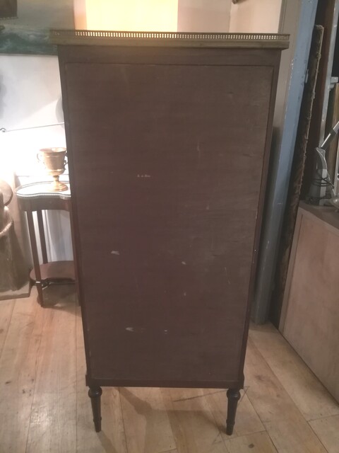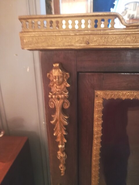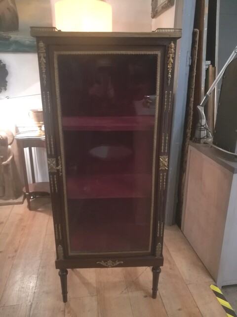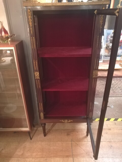 Mahogany, gilt bronze and marble top Louis XVI style glass cabinet
