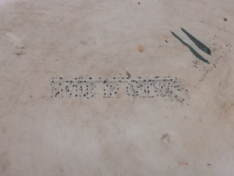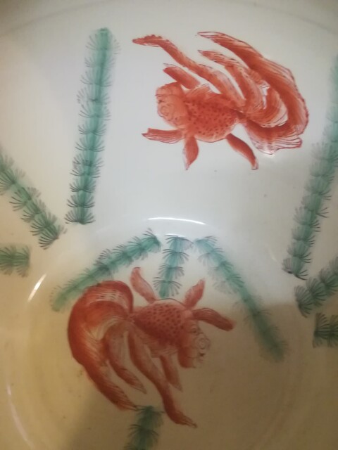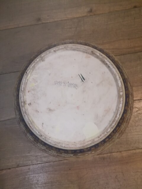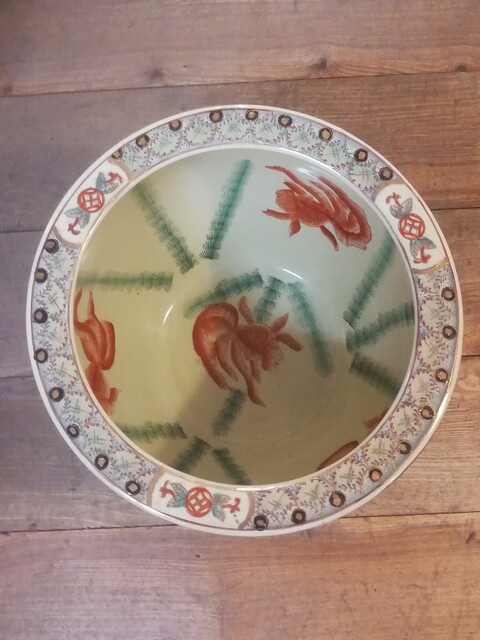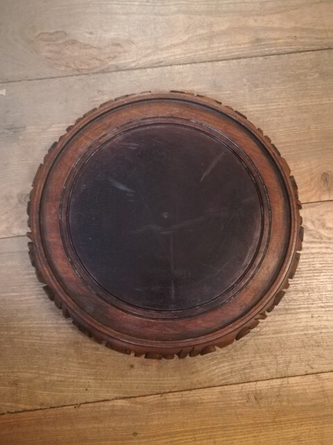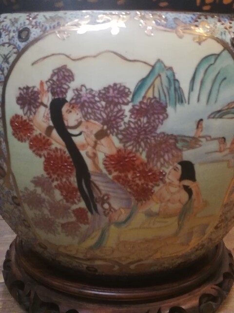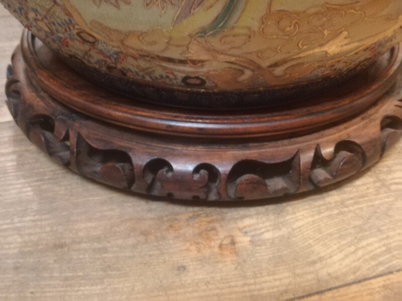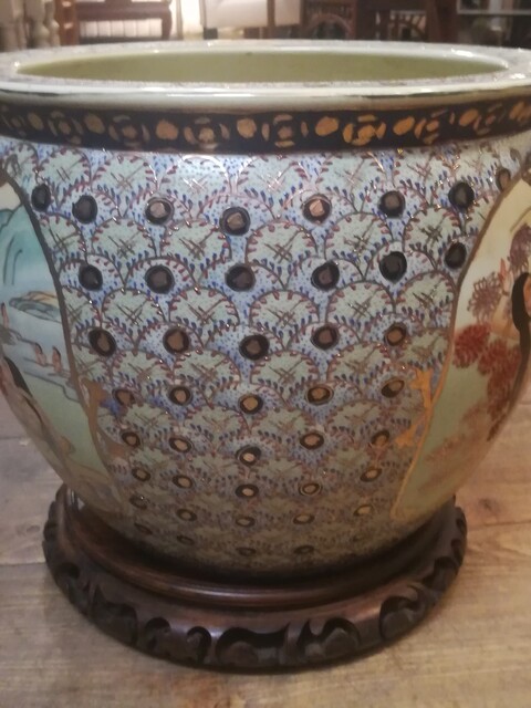 Polychrom porcelain chinese flowerpot on carved wood base