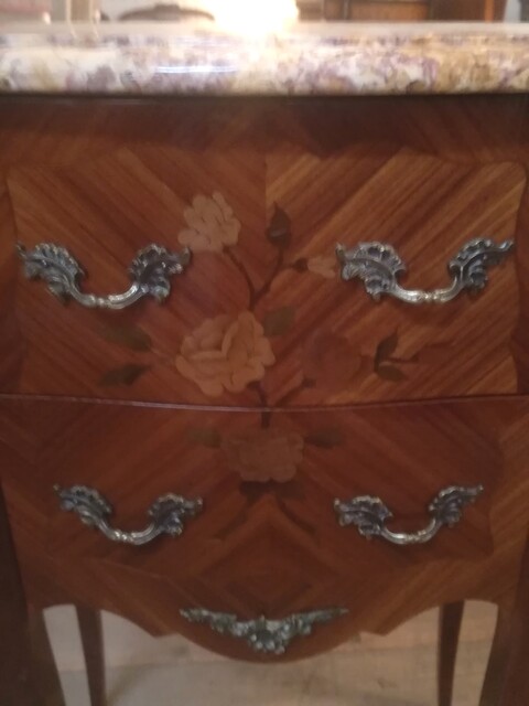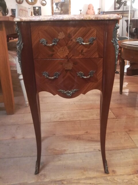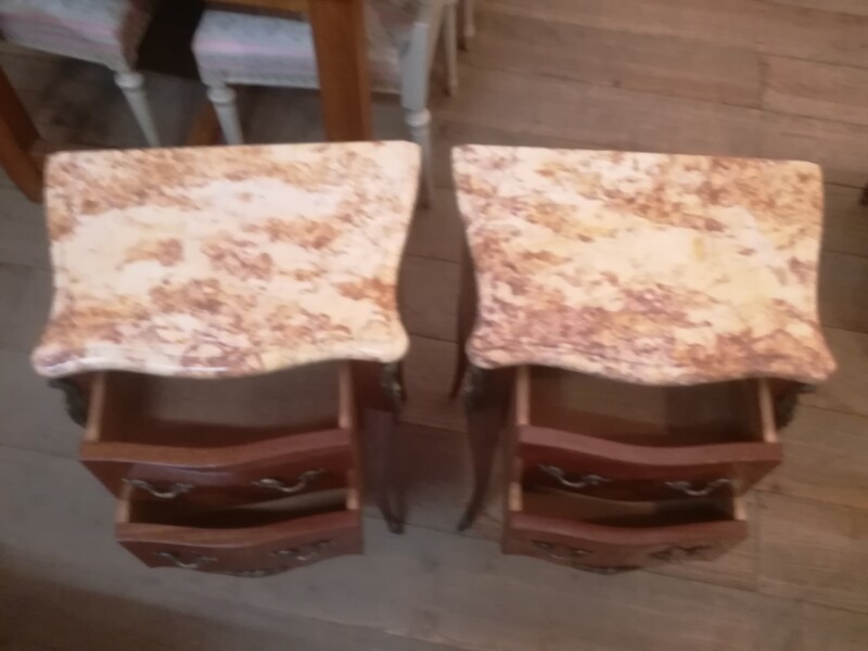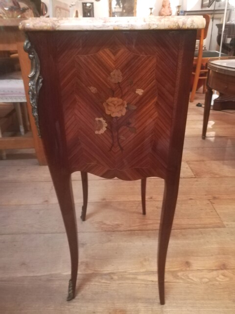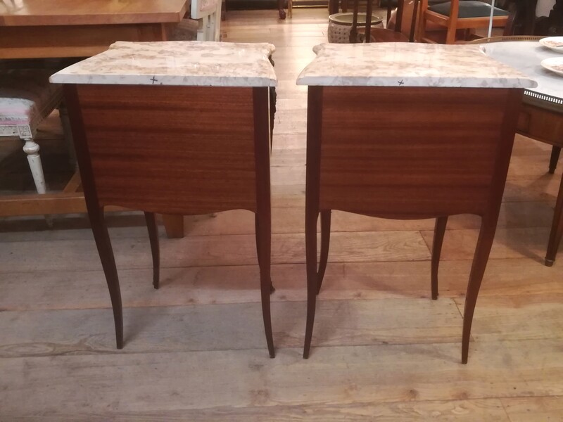 Pair of inlaidand marble top Louis XV style bedside cabinets
