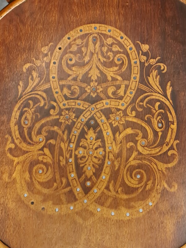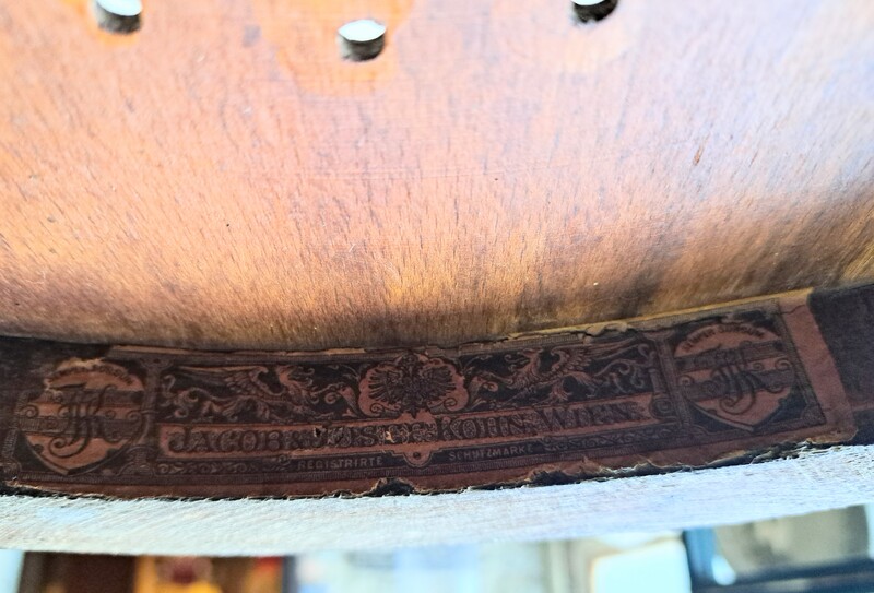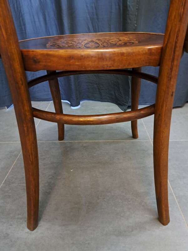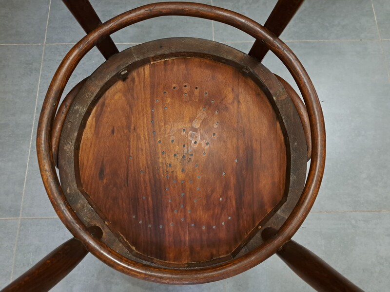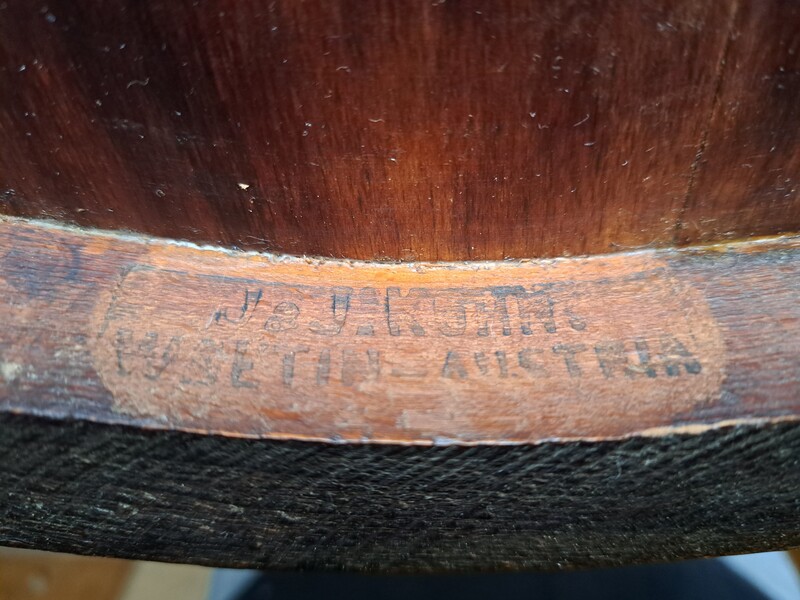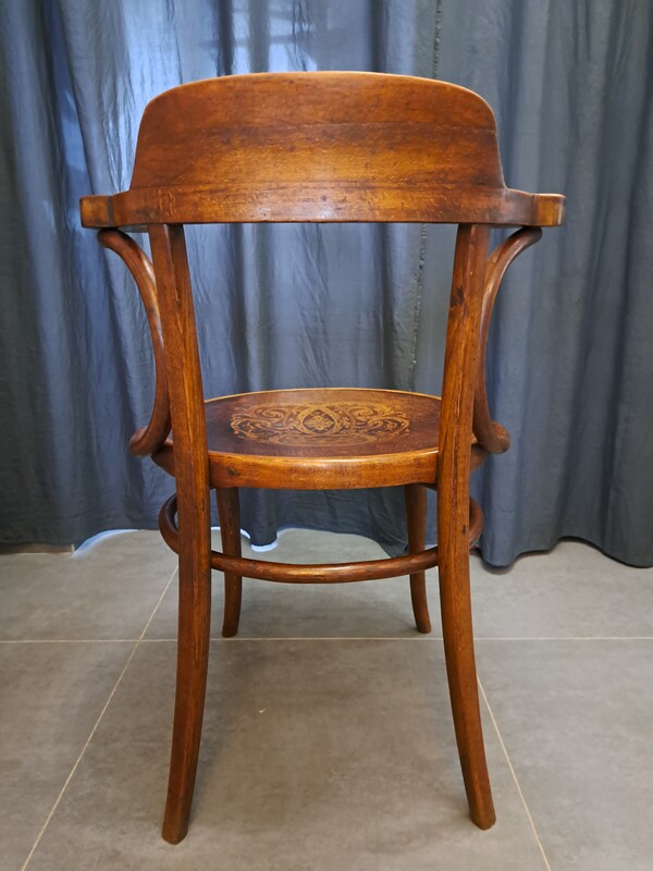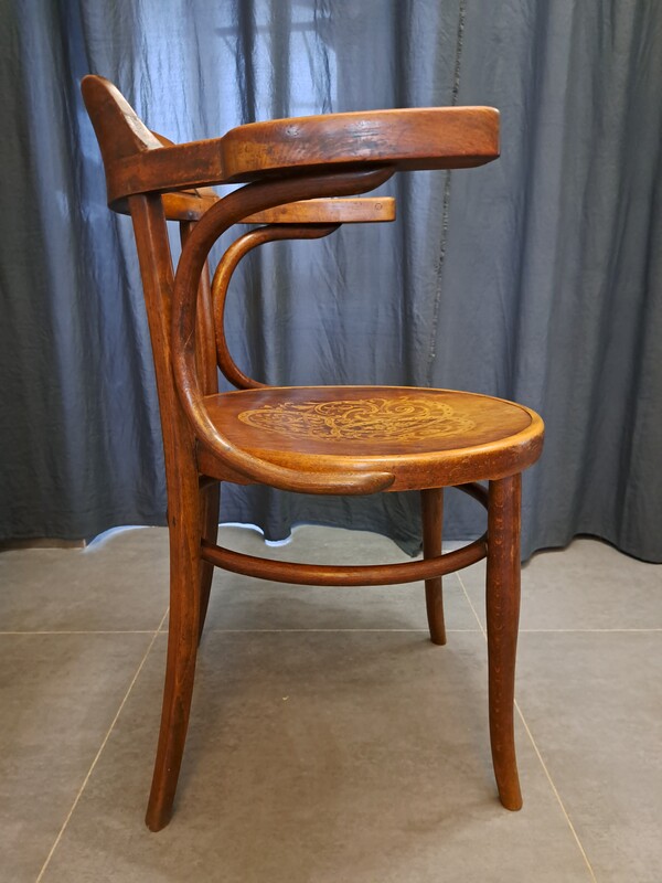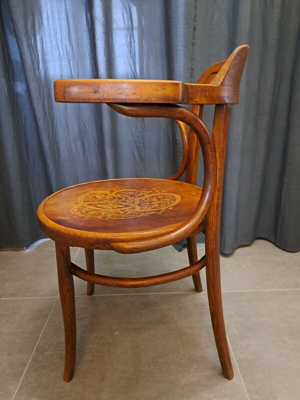 Curved and pyrographed beech wood desk chair of J and J Kohn