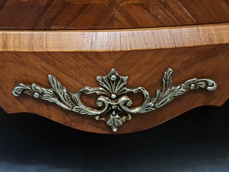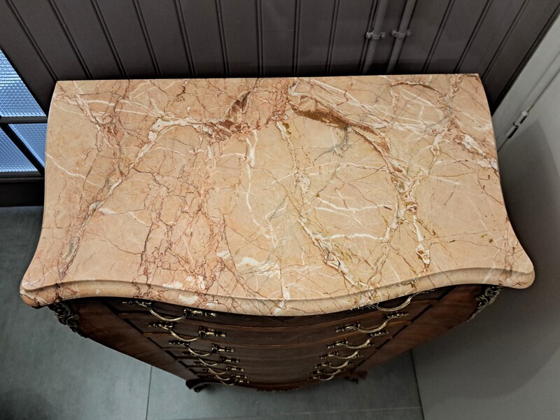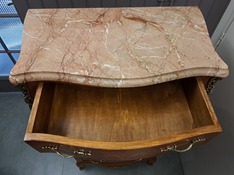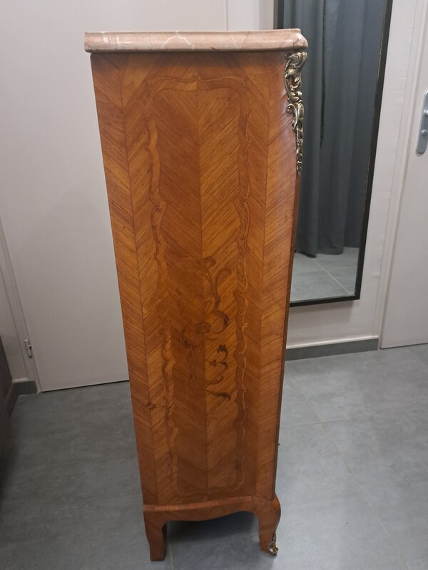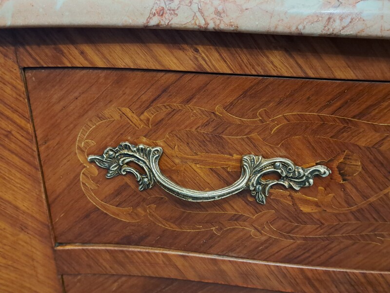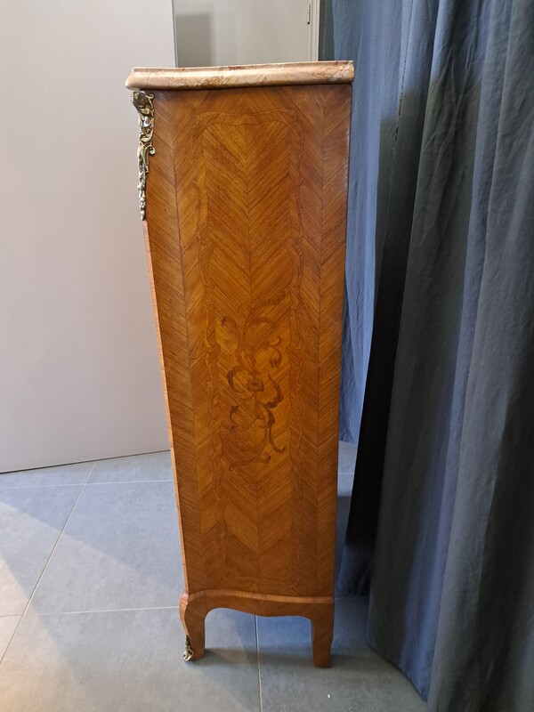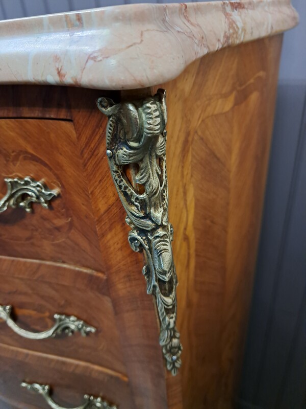 Inlaid, bronze and marble top Louis XV style chiffonier