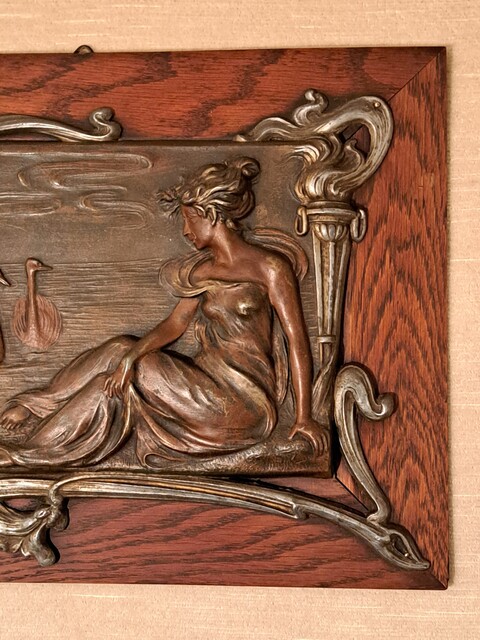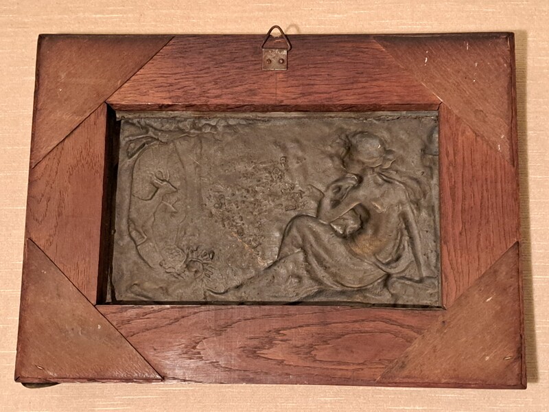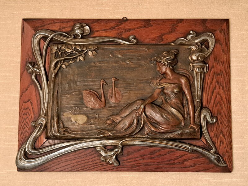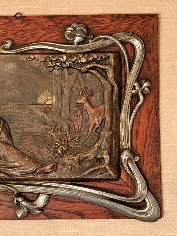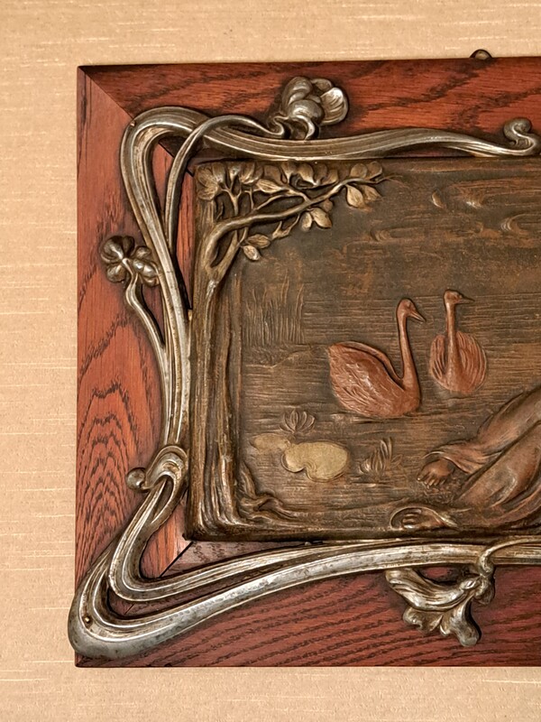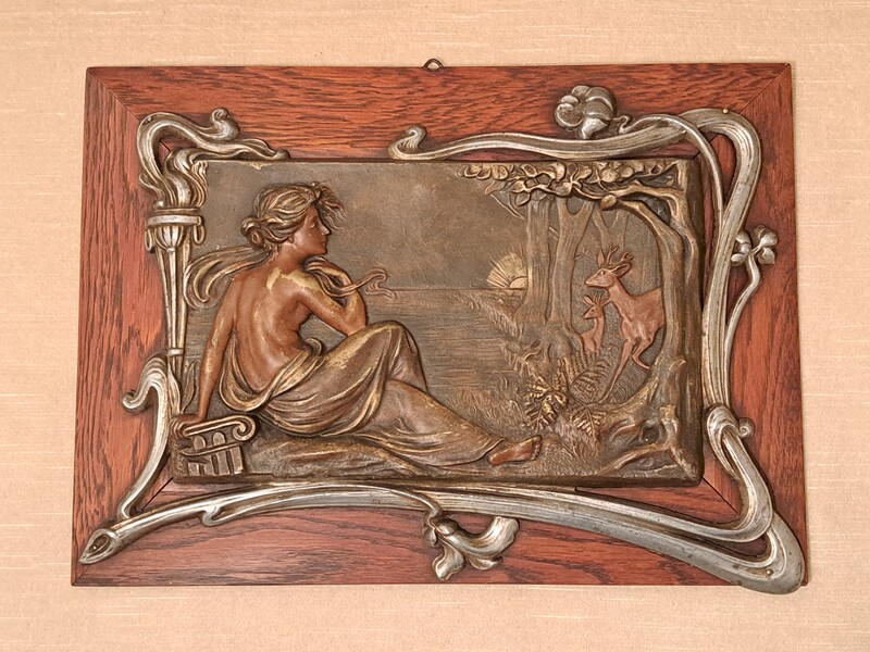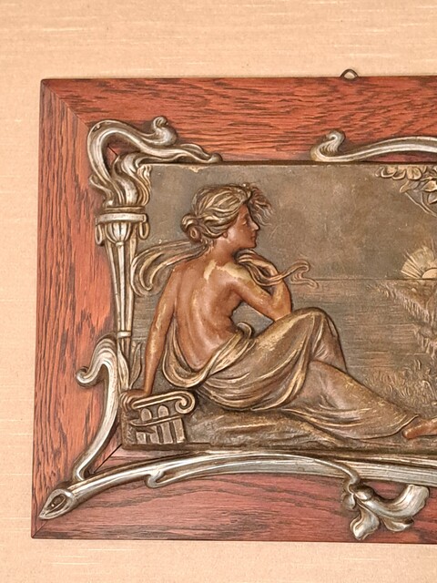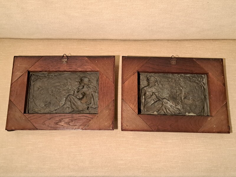 Pair of art nouveau regula bas-relief plaques in wooden frame